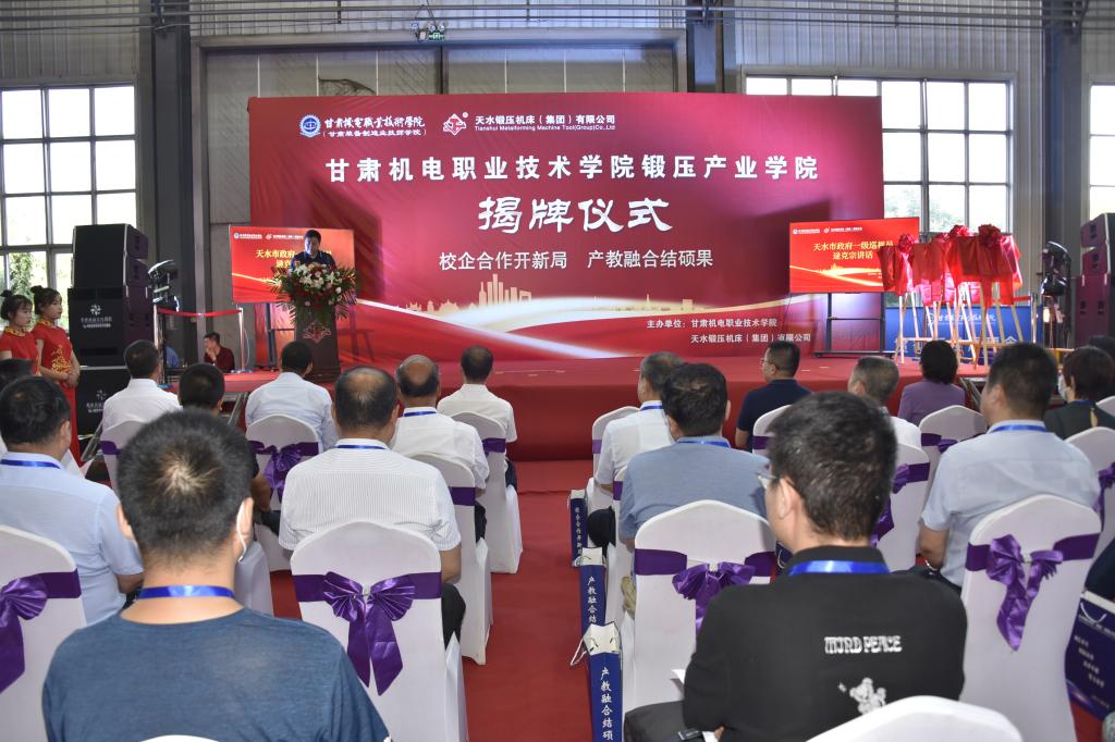 6月28日,甘肃机电职业技术学院锻压产业学院揭牌仪式在天水锻压机床(集团)有限公司隆重举行。天水市政府一级巡视员逯克宗,省教育厅职成处二级调研员胡晶、省人社厅职业能力建设处处长史永斌、省工信厅人事处一级调研员窦晓红,市政府副秘书长冯荣、市政府教育督导室专职副主任王奎、市人社局副局长刘宇、市科技局副局长吴晓堂、市国资委副主任江爱民、市工信局副局长汪亚伟,麦积区副区长成红梅,甘肃工业职业技术学院党委副书记、院长安建平、甘肃林业职业技术学院副院长刘乃君、甘肃能源化工职业学院副院长于喜中、天水市职业技术学校校长张笑青、常州机电职业技术学院教授马雪峰,甘肃机电职业技术学院领导班子成员,天水锻压机床(集团)有限公司领导班子成员等出席揭牌仪式。天水市有关兄弟院校、相关企业及校企双方师生、职工代表参加。