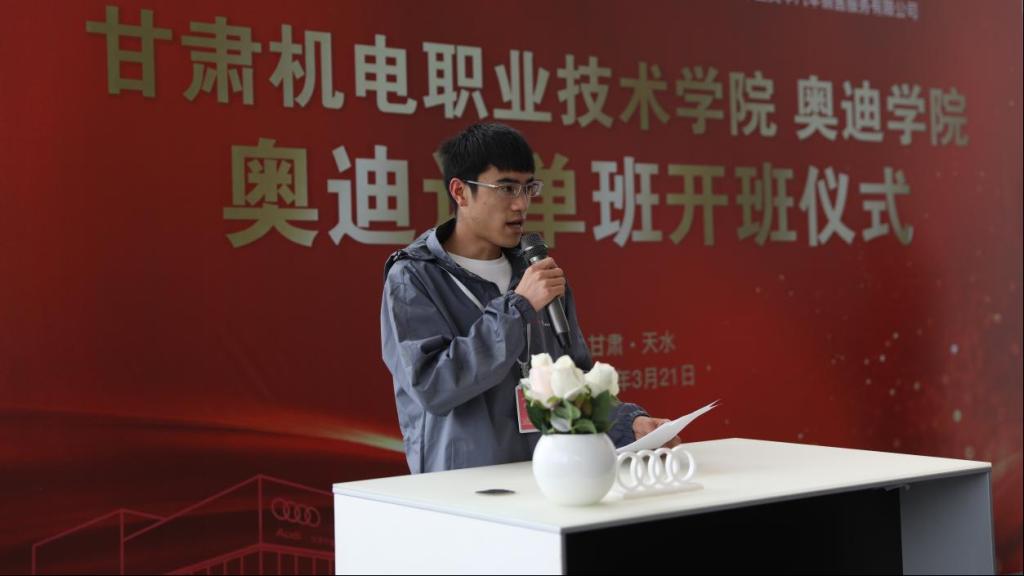 车辆工程学院2019届汽车营销专业优秀毕业生把梅分享了自己如何从一名懵懂学生,成长为甘肃中盛奥华汽车销售服务有限公司人事主管的奋斗历程。CL2122班学生买金明代表“奥迪订单班”全体学生做了表态发言。
